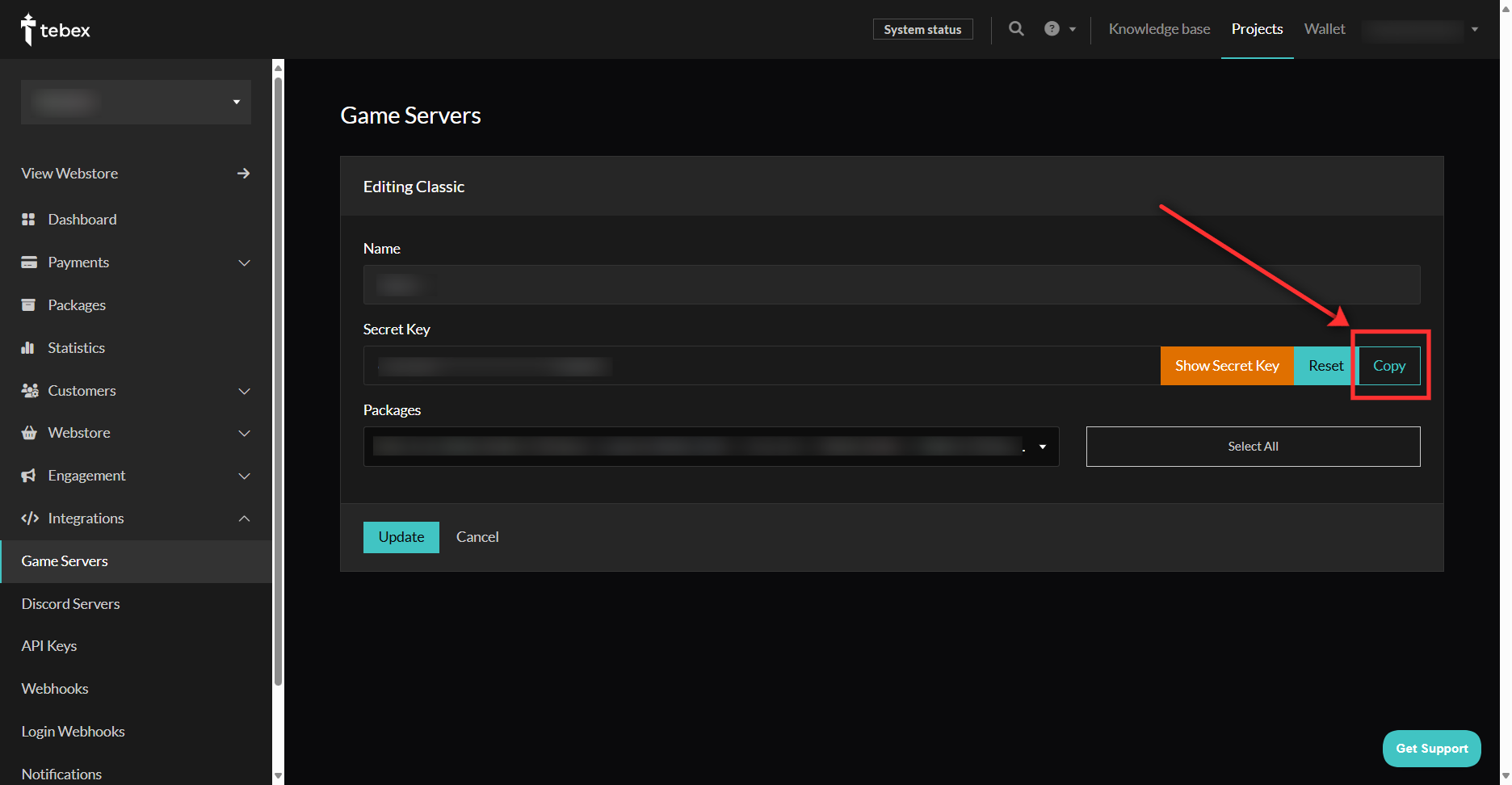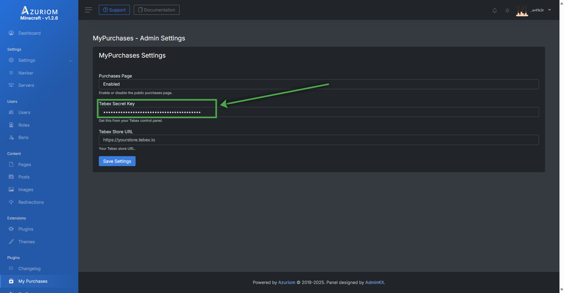 1. Click the "Copy" button to copy your Tebex secret key, and then paste it into the "Tebex Secret Key" field in the Azuriom admin area.