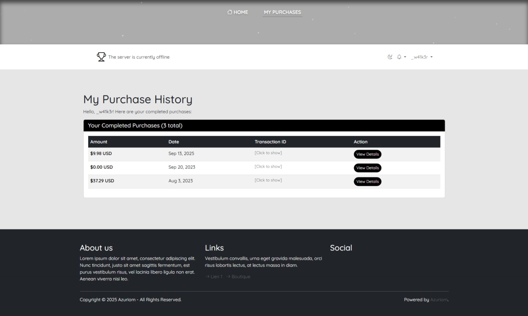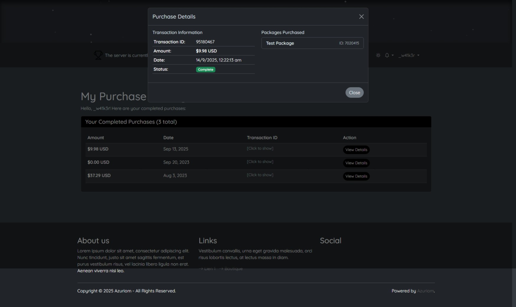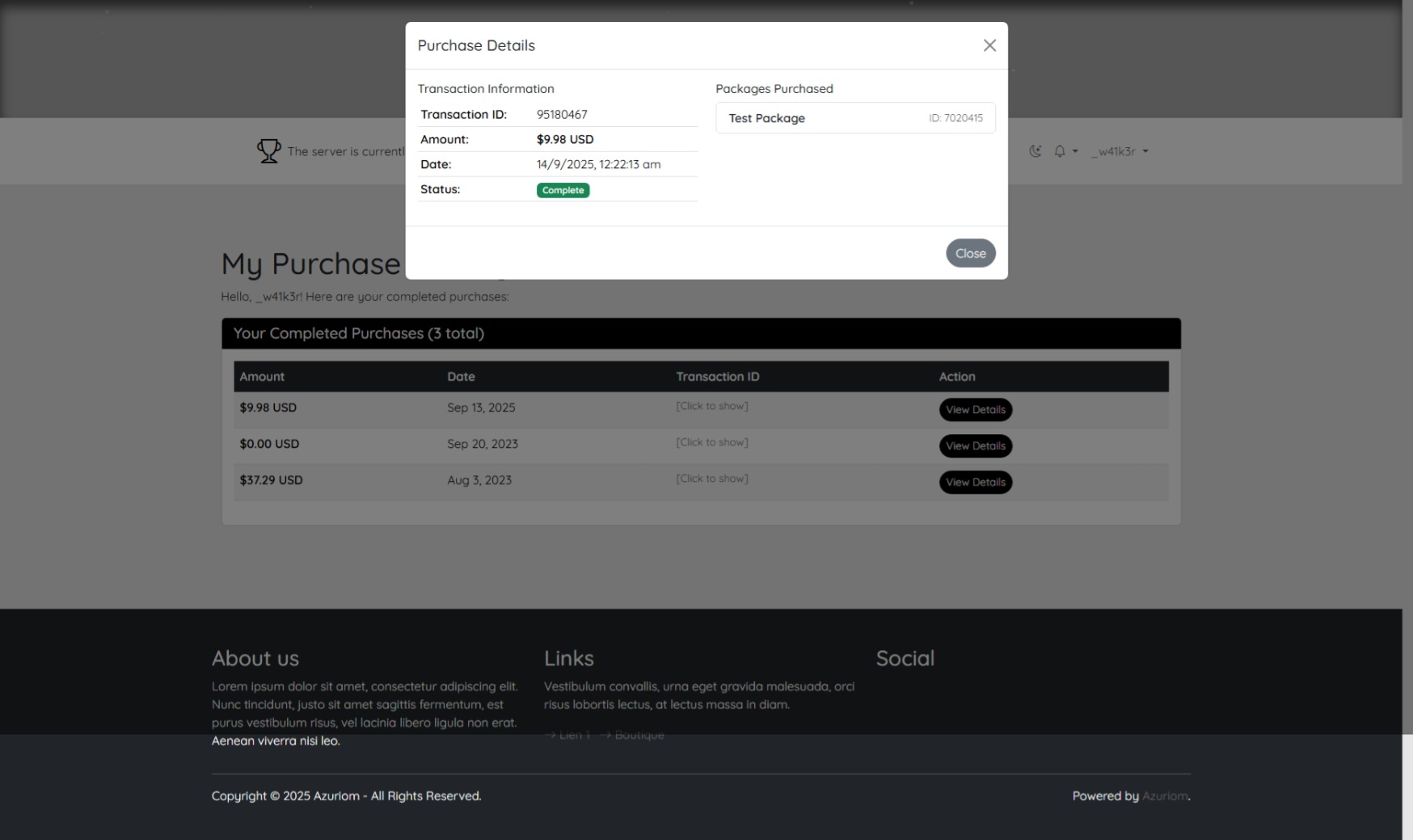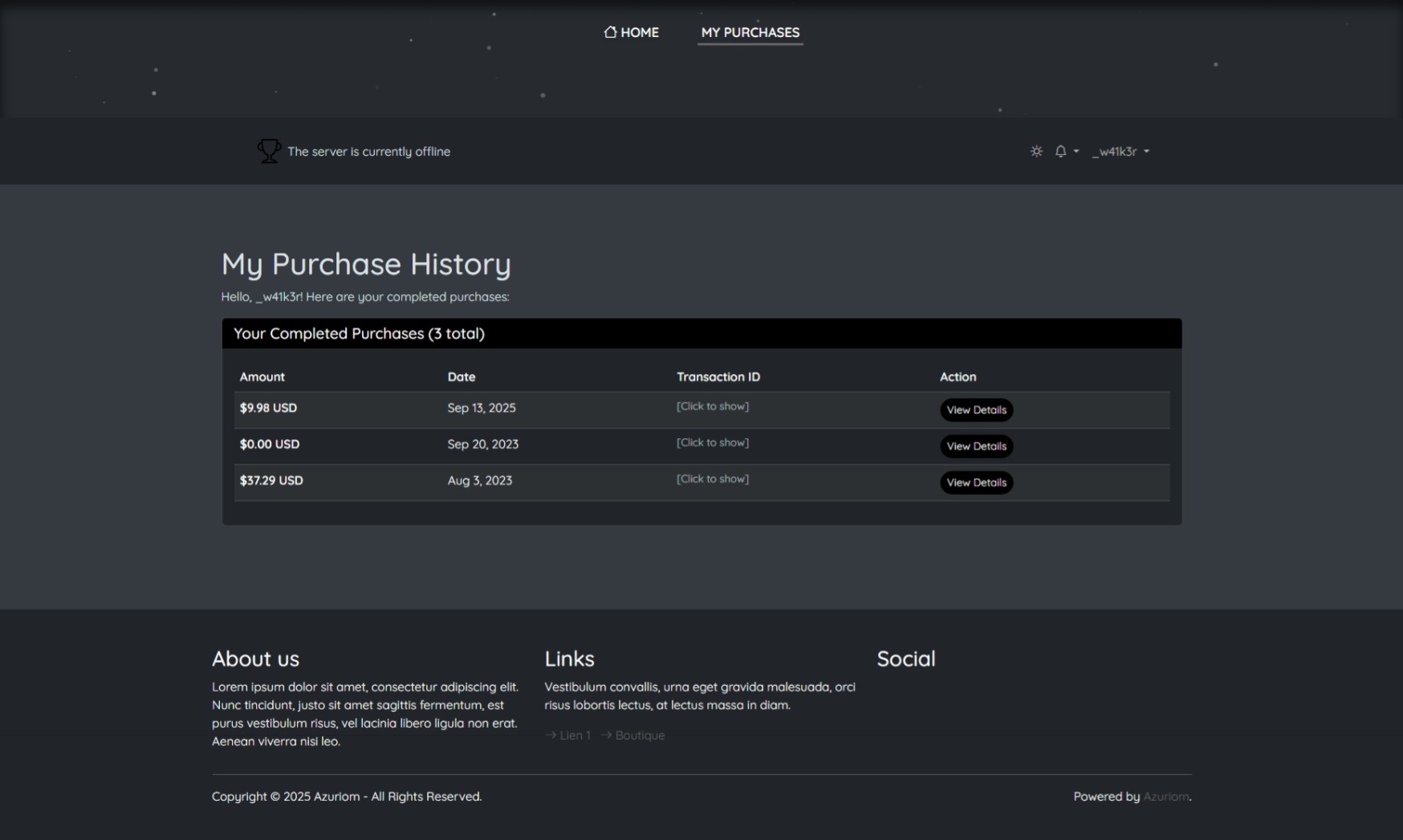 • Secure & User-Specific: The plugin ensures that users can only view their own purchases. It securely links the logged-in user's Azuriom account to their Tebex username.