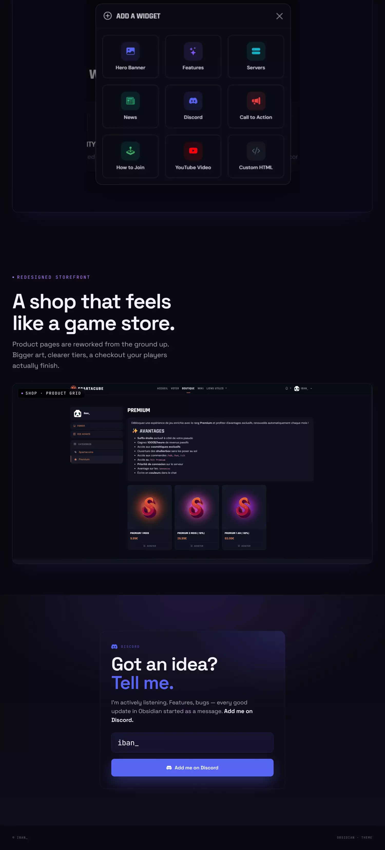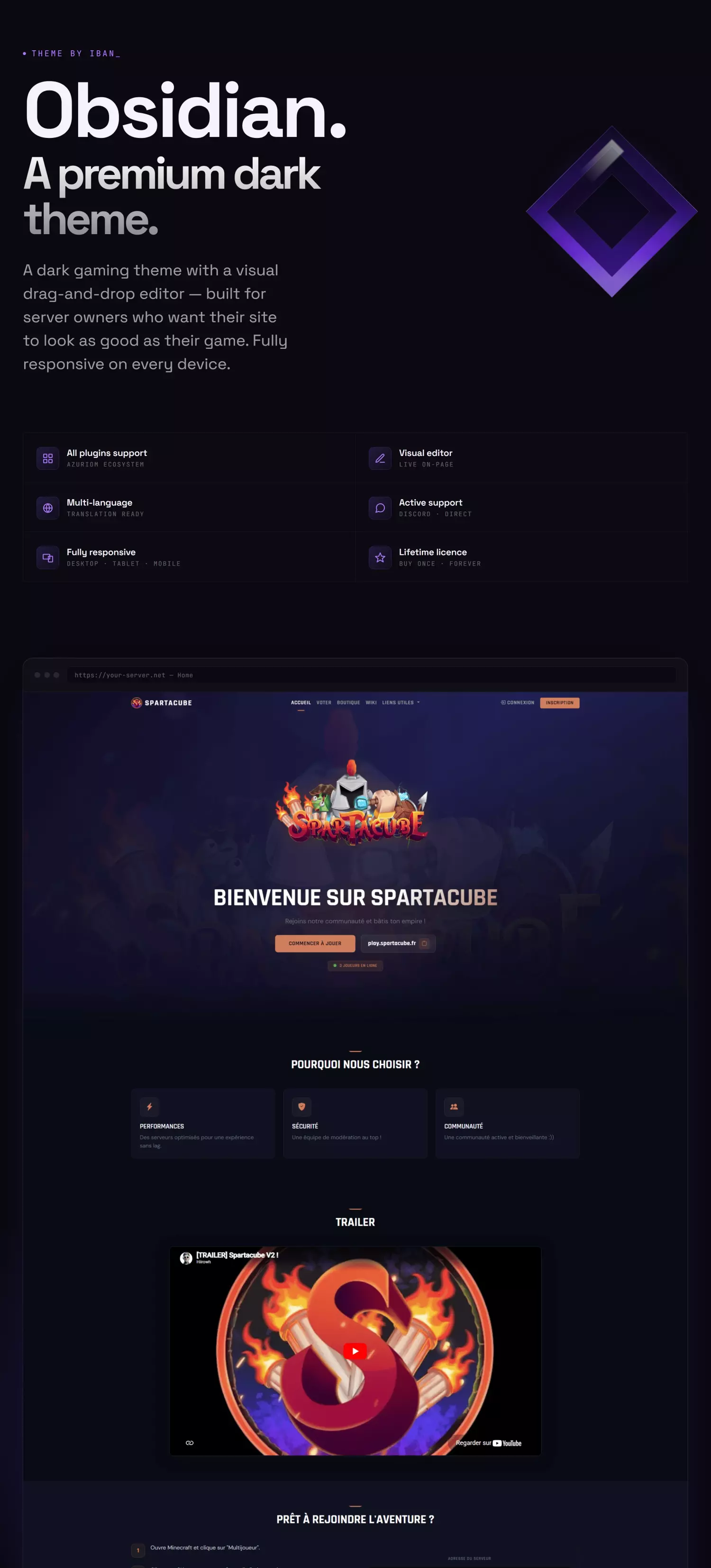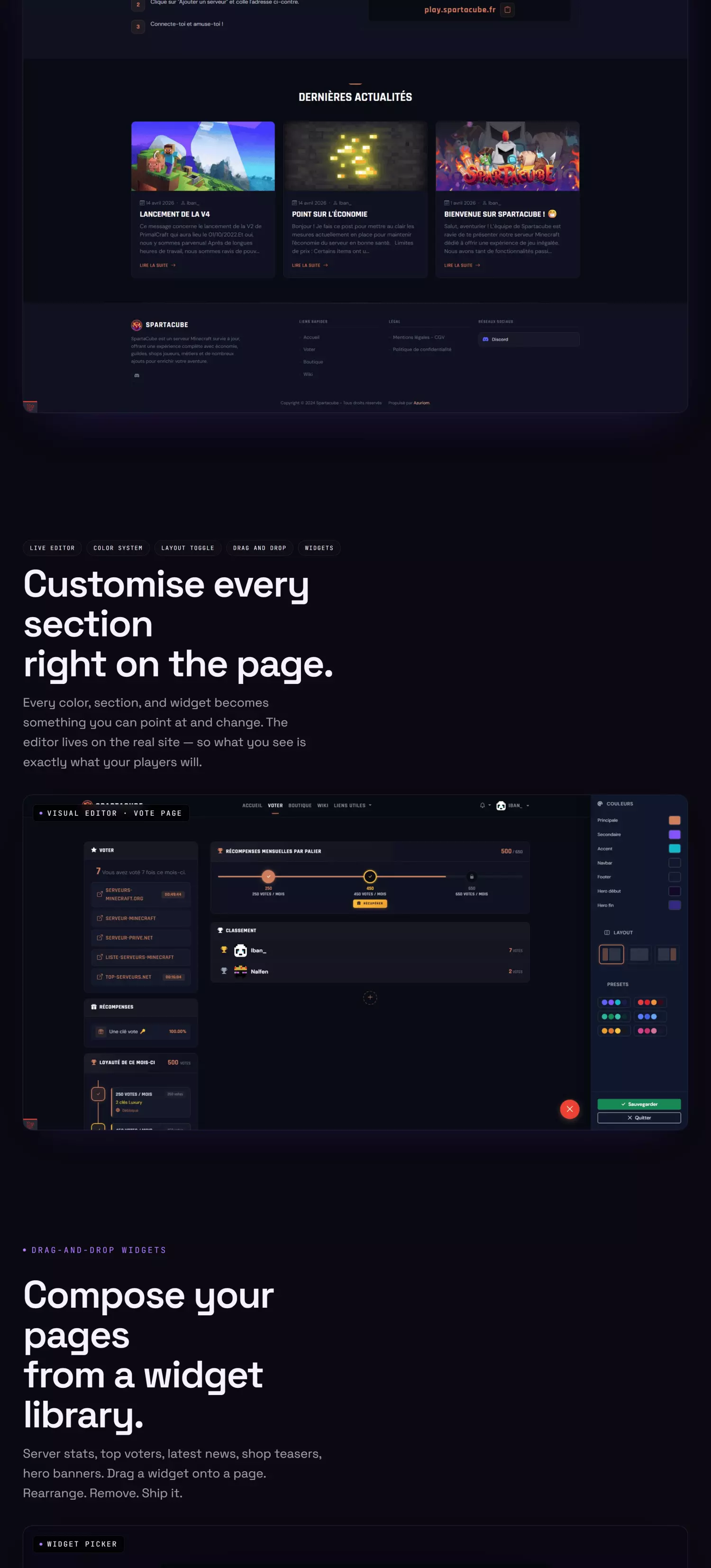 A premium dark gaming theme with a visual drag-and-drop editor.
